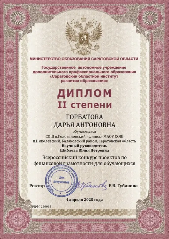 С 23 января по 28 марта 2025 года в ГАУ ДПО «СОИРО» проходил Всероссийский конкурс проектов по финансовой грамотности для обучающихся. Конкурс проводился в целях развития финансового образования и создания основ финансово грамотного поведения и формирования финансовой культуры обучающихся образовательных организаций. На Конкурс поступило 890 заявок от обучающиеся образовательных организаций всех уровней образования из 26 субъектов Российской Федерации от Курской области на западе до Амурской области на востоке, Архангельской области на севере и Республики Дагестан на юге страны. Обучающиеся 1, 4 классов СОШ п.Головановский- филиал МАОУ СОШ п.Николевский, под руководством Шиблевой Ю.П. приняли участие в этом конкурсе и получили свои награды: Диплом 2 степени – Горбатова Дарья, 1 класс Диплом 3 степени – Усинова Арина, 4 класс; Рахметшина Амира, 1 класс. Сертификат участия –